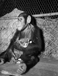Image shows, a frightened stray kitten in the arms of "Annabella Panzee," the zoo chimpanzee. Annabella is holding the stray kitten, protecting her from the approaching cameraman. Two weeks ago a stray kitten wandered into the Forest Park Zoo and made friends with Panzee. Published in the Fort Worth Star-Telegram evening edition July 10, 1942.