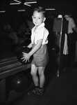 Four-year-old C. F. Payne Junior is an honorary member of the Dallas Bowling team competing in the State Tournament. He is the son of bowler C. F. Payne Senior. C. F. Junior is shown reaching for a bowling ball. He is dressed in a button-up shirt, striped shorts, and suspenders.