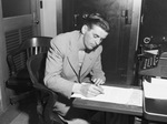 Paul Edward Gibson is a twenty-one year old bank robber from Jeffersonville, Indiana. He is shown singing a confession at police headquarters in Fort Worth, Texas. The confession admits Mr. Gibson's participation in a killing and two bank robberies in Indiana last month. He was arrested with an accomplice, Ernest William Ford. Mr. Gibson is dressed in a t-shirt, striped blazer and matching trousers. There is a typewriter and telephone on the desk and a safe in the background.