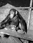Image shows, a frightened stray kitten in the arms of "Annabella Panzee," the zoo chimpanzee. Annabella is holding the stray kitten, protecting her from the approaching cameraman. Two weeks ago a stray kitten wandered into the Forest Park Zoo and made friends with Panzee. Published in the Fort Worth Star-Telegram evening edition July 10, 1942.