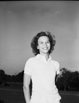 Louise Buckley is a tumbler. Miss Buckley is standing outside and smiling. Published in the Fort Worth Star-Telegram.