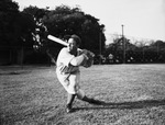 The amateur baseball season will soon open their 1946 season. B. Barnhill is a player manager for the Convair baseball team. His team will play the Fort Worth Army Air Field (FWAAF) opening day. Barnhill is shown demonstrating the violent follow-through of his right-handed swing. He is dressed in a baseball uniform.