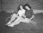 The victors of the marathon tennis doubles match, left to right, Jackie Ferree and Bonnie Beaton, of Paschal High School. They competed against Polytechnic High School in the tournament. Both ladies are sitting on the grass side by side, holding their tennis rackets. Miss Ferree is wearing a button-up blouse and shorts. Miss Beaton is dressed in a t-shirt and shorts.
