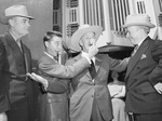 The Rexall Drug Convention is being held in Fort Worth, Texas. Performing a comedy skit on the steps of City Hall, left to right, are Sheriff Dusty Rhodes, Garry Moore, Jimmy Durante, and Mayor Roscoe Carnrike. Mr. Moore is holding a tiny hat over Durante's nose. The skit was performed after Mayor Carnrike presented the comedians with regulation-size western headgear in a "Welcome to Fort Worth" ceremony. Sheriff Rhodes is wearing a hat and a double-breasted pinstripe suit. Mr. Moore is wearing a suit and a bow tie. Mr. Durante is dressed in a cowboy hat and a suit. Mayor Carnrike is wearing a hat and a double-breasted suit.
