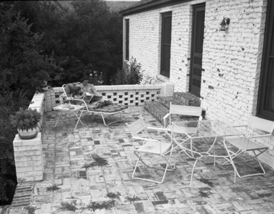 Mrs. Robert B. Young Junior and her four-year-old daughter, Jane, shown relaxing on their back porch which stretches across the back of their ranch style home. On the porch are glass-top tables, a canvas upholstered chaise lounge and metal porch chairs. Mrs. Young and Jane are sitting on the chaise lounge, reading a magazine. Mrs. Young is wearing a striped dress.