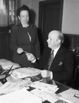 The Woman's Traffic Club is selling tickets for the May Flower Show in Fort Worth, Texas. Mayor Roscoe Carnrike is shown purchasing a book of tickets from his secretary, Miss Stella Pearcy. Mayor Carnrike, of Fort Worth, Texas, is sitting at his desk, dressed in a dark, double-breasted suit. Miss Pearcy is the ticket chairman for the Woman's Traffic Club. She is wearing a blazer, brooch, and a skirt. Proceeds from ticket sales will go to the Fort Worth Children's Hospital Fund.