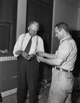 Star-Telegram Junior. Hal Phillips, right, handing billfold to Upshur Vincent. Both men are standing in a room. Mr. Phillips is wearing a shirt, trousers and suspenders and Upshur Vincent is wearing a shirt and trousers.