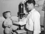 Gary Don Beverly, left, shown standing up with the help of his cousin, Robert M. Hensley. Garry Don and his parents are experiencing the housing shortage in Fort Worth, Texas, first hand. They are looking for a home after being asked to leave their one-room apartment. Gary Don is wearing a onesie. Mr. Hensley is dressed in a button-up shirt and trousers. There is a Federal Photo Enlarger in the background.