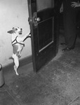 "Jerry" the talking Fox Terrier is visiting the Fort Worth Star-Telegram Wednesday afternoon. He is the five-year-old companion of Riley Bryan. Mr. Bryan is a photographer from Grundy, Virginia. He has taught Jerry numerous tricks including: "speak," "close the door," "bring the paper," and "use the typewriter." Jerry is pictured demonstrating the door closing trick. He is standing on his hing legs, closing a door that someone is standing behind.