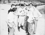 Joe DiMaggio, the star center-fielder of the New York Yankees, is visiting Fort Worth, Texas. The Yankees are playing the Fort Worth Cats in a Spring Training exhibition game. DiMaggio is shown autographing a baseball for fourteen-year old Don Wade, a student at Polytechnic High School, as a crowd of admirers watch. DiMaggio is returning to the Yankees for the 1946 season after spending the past three seasons in the military. He is dressed in the Yankees' road gray uniform. Joe DiMaggio was later inducted into the Baseball Hall of Fame in 1955.