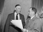 The National Livestock Producers Association is meeting at the Blackstone Hotel in Fort Worth, Texas. In attendance, left to right, are A. A. Wright and J. W. Mitchell. They are discussing the program for the national report meeting of the organization. Mr. Wright is the manager of the Fort Worth, Texas, chapter of the association. He is dressed in a striped suit. Mr. Mitchell is a manager for the association at Evansville, Indiana. He is dressed in a double-breasted suit.