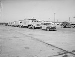 The largest Mobile Recruiting Unit in the United States was assembled at the Fort Worth Army Air Field (FWAAF). The unit will hit the road Monday to begin recruiting all across the county. Pictured are a line of military vehicles containing various displays and features. The trucks are labeled "Army Air Force".