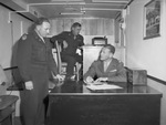 Larsen, T. E. (Capt.); Hartman, W. E. (CWO.); Johnson, E. L. (Lt. Col.); Mobile Recruiting Unit; Fort Worth Army Air Field (FWAAF); Military Vehicles; Automobiles; Recruiting & Enlistment; Offices; Desks; Military personnel; Military uniforms; United States. Army Air Forces