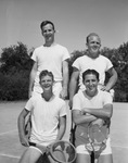 Members of Texas Christian University's (T. C. U.) men's tennis team are shown on the tennis court with their tennis rackets. Pictured left to right, standing, are Fred West and Ray Robbins. Kneeling are Harold Manning and Jack Levinson. All four men are dressed in their tennis uniforms: a t-shirt and shorts.