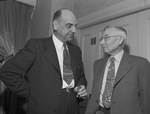 The National Livestock Producers Association is meeting Thursday night in Fort Worth, Texas. In attendance, left to right, are P. O. Wilson and H. L Kokernot Senior. Mr. Wilson, of Chicago, Illinois, is secretary of the association. He is dressed in a pinstripe suit and is smoking a cigar. Mr. Kokernot, of San Antonio, Texas, is president of the Texas Livestock Association. He is wearing a suit.