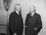 The National Livestock Producers Association is meeting Thursday night in Fort Worth, Texas. In attendance, left to right, are G. R. White and Dick Arnett Junior. Mr. White, of Brady, Texas, is dressed in a double breasted pinstripe suit. Mr. Arnett, of Kansas City, Missouri, is wearing a double breasted suit. The men both formally and informally tackled questions regarding the meat shortage.