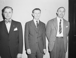 The Acme Brick Company is holding an annual stockholders meeting. In attendance, left to right, are E. J. Robinett, George Puls and Neill Boldrick. All three long-term employees were elected to vice presidencies. Their length of service with the firm averages 20 years. Mr. Robinett is wearing a suit with a bow tie. Mr. Puls is dressed in a three-piece, striped suit. Mr. Boldrick is wearing a tweed suit.