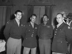 The Fort Worth Army Air Field is hosting Army Day ceremonies. In attendance, left to right, are Lieutenant E. L Brady, Captain K. C Hawk, Captain R. M. Robertson, and Lieutenant T. L. Brown. They are the staff officers who accompanied honored guest Lieutenant General George E. Stratemeyer. All four men are standing in the "at ease" position, dressed in their military uniforms.