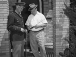 Two brothers-in-law are discussing an upcoming fishing trip. They are, standing left to right, Major General John H. Hilldring and J. E. Foster Junior. General Hilldring is the new assistant secretary of state. He is dressed in his military uniform. Mr. Foster is demonstrating his fishing gear. He is wearing a hat, button-up shirt, and trousers. The men are planning to take their wives fishing on a lake on Foster's ranch, located southwest of Fort Worth, Texas.