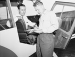 The owners of the Handley Airport, left to right, are Paul Allen and W. C. Johnson Junior. Mr. Allen, pictured in the cockpit, flies the planes while Mr. Johnson fixes them. Mr. Allen was a flight and ground school instructor for the Army Air Force during the war. He is wearing a dress shirt, necktie, and trousers. Mr. Johnson served fort-two months with the United States Navy. He is dressed in a button-up shirt and striped trousers.