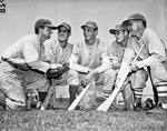 The Fort Worth Cats, a minor league affiliate of the Brooklyn Dodgers, are preparing for the upcoming 1946 season. Coaches are attempting to pair down the Spring Training roster from sixty-six players to fifteen. The remaining players will either be claimed by others in the Brooklyn farm system or be released outright. Pictured left to right, are Hayden Greer, Leo Thomas, Danny Ozark, Pete Spatafore, and Earl Benson. These four players will join the Abilene Blue Sox. Greer was recently named player manager.