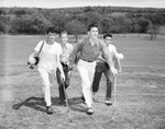 High School golfers are competing in a Saturday tournament at the Meadowbrook Country Club. Climbing a hill to the 17th green, left to right, are Bill Leahy, Doyle Gilliam, Bob Gilmartin, and Warren Shipman. They are shown carrying their bag of clubs as they make their way to the green. Leahy and Shipman are representing Arlington Heights High School. Gilliam and Gilmartin are both from Polytechnic High School. All four boys are dressed in golf attire. Gilliam shot a 75, leading to Polytechnic's victory.