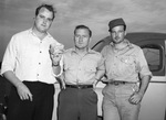 Members of the International Association of Machinists are on strike from the Consolidated Vultee Aircraft Corporation (C. V. A. C.). Monday afternoon there was an altercation outside the aircraft manufacturing plant between Convair employees and workers on strike. Three men involved in the fight, left to right, were R. J. Brever, D. W. Howard, and Lee B. McKinney. Mr. Brever is holding a rock, similar in size to the one thrown through his car window as he drove into work. He is dressed in a button-up shirt and dark trousers. Mr. Howard is wearing a short-sleeve shirt and trousers. Mr. McKinney is dressed in a hat, button-up shirt, and trousers.