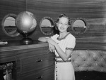 Mrs. Frank Engels III, the former Miss Harriet Laubach, of Saint Louis, Missouri, poses next to a tall cabinet. On top of the cabinet is a globe. There are porthole windows in the room. Mrs. Engels is wearing a dress with an embroidered pattern around the waist, neckline, and edge of the sleeves.