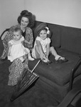 Mrs. Harry Backus and her two children, Judith Kay and Marilyn are shown dressing-up in Japanese clothing. The souvenirs were sent back from Okayama, Japan, by Sergeant Backus, who is serving in the United States Army, 24th Division. The family is shown sitting on a couch. Mrs. Backus is wearing a patterned kimono. Judith Kay is wearing a dress with a bow at the front. Marilyn is wearing a Japanese hat, button-up blouse, and shorts. She is trying on traditional Japanese shoes called Geta.