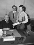 The first Western Union package is being delivered since the resumption of the company's errand service. Pictured left to right are Ed Winton, George C. Wilkinson, and Larry Gardner. Mr. Winton, president of Continental National Bank, is receiving the package. He is dressed in a dark, three-piece suit. Mr. Wilkinson is the delivery manager for the Western Union. He is wearing a suit. Larry, Union messenger boy, is delivering the package. He is wearing a button-up shirt and trousers. His hat is tucked underneath his arm.