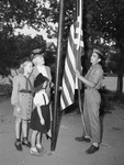Scout Ernest Neuman is a raising the flag presented to the Boy and Girl Scouts of the Lena Pope Home. The flag is being raised during a ceremony Monday afternoon. Standing to the left of the flagpole are Mrs. C. P. Henley, Effie Ruth Hasley and Eula Clark. Mrs. Henley is chairman of the flag committee for the Daughters of the American Revolution (D. A. R.). She is wearing a hat, collared blouse, blazer, and a skirt. Effie Ruth, a Girl Scout, is dressed in her uniform. Eula, a Blue Bird, is also wearing her uniform.