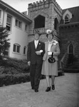Mr. and Mrs. Alexander Kennedy were married Tuesday, April 9, 1946, at First Presbyterian Church in Fort Worth, Texas. The newlywed couple is shown walking outside the church with their arms linked. Mr. Kennedy is dressed in a hat, pinstripe suit, and a boutonniere. Mrs. Kennedy, the former Miss Marie Steven Myles, is wearing a hat with a veil, a lacy blouse, blazer, skirt, gloves, and a corsage. The couple plans to make their home in Asheville, North Carolina.