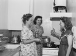 Tuesday was moving day for four Texas Christian University (T. C. U.) ministerial students and their families. The families are shown helping the students get settled in the new quadruplex adjoining the campus. Cooking a meal in the kitchen, left to right, are Mrs. Hugh Baker, Mrs. Jack Suggs, and Mrs. Paul Bender. Both Mrs. Baker and Mrs. Suggs are wearing floral dresses. Mrs. Bender is wearing a polka-dot dress.