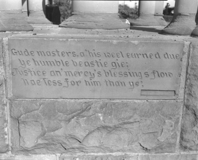 Inscription on horse trough at Courthouse Square, downtown Fort Worth. The inscription reads, " Gude masters, a'his weel earned due, ye humble beastie gie; Justice an' mercy's blessings flow naetess for him than ye."