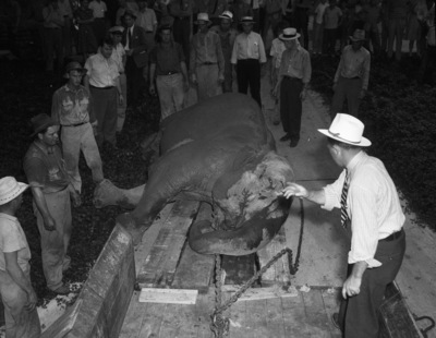 Elephant at Forest Park Zoo, "Sugar" was sentenced to die after a savage attack on her zookeeper. After she was shot, the zookeepers loaded her on a truck. A crowd of people are surrounding the truck.