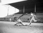 Lou Rusher, number 50, is the left handed first basemen for the Fort Worth Cats. The six-foot-two, 205 pounder stretches far to the right to pick a wild throw, just beating number 45 to the bag. Mr. Rusher is wearing his practice uniform with a cap, stirrups, and cleats. There is a coach watching the players in foul territory.