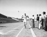 Horace Maddux is representing Paschal High School in the 440-yard dash Thursday afternoon at Farrington Field. He is shown breaking the finish line tape in a "victory pose." His nearest competitor is rounding the last turn. A group of men are standing on the sidelines, recording Maddux's time.