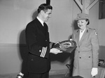 The Naval Air Service Squadron (N. A. S. S.) is showing their appreciation to the local chapter of the American Red Cross. Commander W. M. Collins is shown presenting a plaque to Mrs. W. K. Stripling. Commander Collins commands the Naval Air Service Squadron, 3. He is dressed in his military uniform. Mrs. Stripling is the chairman of volunteer special services for the Tarrant County Red Cross. She is wearing her uniform.