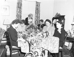 A group of a dozen women have been rug hooking since 1942. The club is meeting at the home of Mrs. Mittie McCammon. Sitting in a semi-circle, left to right, are Mrs. G. Layne Addison, Mrs. Chris Hill, Mrs. Mittie McCammon, Mrs. Eugene Tipton, Mrs. Uel Stephens, and Mrs. Roy C. Stephens.