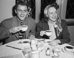 Bobby Specht and Donna Atwood are the young skating stars of the Ice-Capades. They will be preforming at Will Rogers Memorial Coliseum from April 13-18, 1946. They are shown drinking a cup of coffee upon arriving at Hotel Texas. Mr. Specht is dressed in a tweed suit. Miss Atwood is wearing a scarf in her hair, a blouse with a bow tied at the collar, and a blazer.
