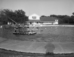 Swimming pool at Sycamore Park. Boys and girls are swimming in the pool and sitting on a floating diving board, and one boy is in mid-dive. There is a slide into the pool in the background. Published in the Fort Worth Star-Telegram.