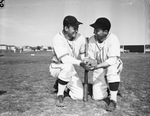 Jim Barnett, left, a pitcher for Texas Christian University (TCU), was lost to the team on ineligibility when it was discovered that his transfer credits were incomplete. Charles Pressley, right, of Lubbock, Texas, is another hurler recently added to the Frog staff. Both men are wearing their baseball uniforms, kneeling on the field. Pressley is wearing a glove and holding a baseball. There is a bat between them.