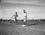 In the third inning of the Texas Christian University vs. Baylor University game, TCU's Brown Chiles almost beat out an infield hit but was nipped at first. Fred Grevelle, first basemen for the Baylor Bears, was off the bag when the photo was snapped, but his spikes came down in time. There are automobiles parked along the third base side of the street.