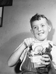Bobby Hicks of R. Vickery Elementary School plucks a brand new, smooth, white baseball from its box and tinfoil wrapper. Official Texas League baseballs are coming back into action after being in storage for almost four years. Bobby is leaning against a wall, wearing a short sleeve shirt and overalls.