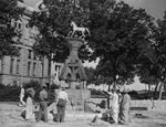 The crumbling horse trough which has stood at the southeast corner of the Courthouse Square for 48 years is to be razed to make way for modern paving, but it will be restored elsewhere as a historic monument. On the statue, in stone, reads "Gude masters a' his weel earned due ye humble beastie gie; Justice an'mercy's blessings flow nae less for him than ye." A group of employees of the City of Fort Worth are standing around, looking at the statue.