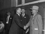 The Missouri-Kansas and Texas Writers Tour is making its final stop in Fort Worth, Texas, for the grand finale. Pictured left to right are Victor Eubank, Carlton A. Shively, and Homer Covey. Mr. Eubank is a financial editor of the New York Associated Press. He is dressed in a double breasted suit. Mr. Shively is the financial editor of the New York Sun. He is dressed in a hat and a three-piece pinstripe suit. Mr. Covey is the president of the Fort Worth Chamber of Commerce. He is offering a handshake to the visitors. Mr. Covey is dressed in a hat, double breasted suit, and a bow tie.