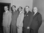 The Agricultural and Mechanical College of Texas (A & M) is holding its annual Aggie Muster. The Muster is a celebration of camaraderie as the school comes together to remember the lives of lost Aggies. The 43rd annual muster is being held on Easter Sunday at First Methodist Church in Fort Worth, Texas. Standing in a line, left to right, are Ed Baker, H. E. "Buck" Cunningham, John Funderburgh, Melvin J. Miller, and Uel Stephens. In addition to the Fort Worth celebration, meetings have been scheduled in 37 states, Germany, Italy, and Manila.