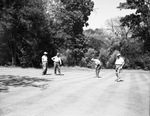 A foursome is enjoying a beautiful spring day with a round of golf at the Colonial Country Club. Pictured on the green of the fifth hole, left to right, are Tom McGinley, James Wilson, Gilbert Ward, and Reub Berry. Ward is shown moments before seeking a twenty-foot putt for a birdie-three. He went on to finish the day with a 75. All four men are dressed in golf attire.