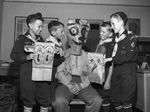 Members of Cub Pack 10 of Arlington Heights Christian Church got a big kick out of their pack master, Rex Rader, center, modeling a mask. They made the masks for the upcoming Boy Scouts Circus. Left to right, the Boy Scouts are Howard Gibson, Jack Rader, Joe Johnson and Rusty Johnson. The boys are dressed in their scout uniforms. Howard and Rusty are holding two of the other masks they made.