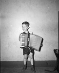 Jack Randle is a child virtuoso from White Settlement, Texas. With his pint-sized accordion, he will perform an "Easter concert in the park" at the Forest Park Zoo. Proceeds from the concert will go to the Baby Hippo Fund and help bring Memphis Belle to Fort Worth, Texas. Jack is the five-year old son of Mr. and Mrs. George Randle. He is shown standing against a wall with his accordion.
